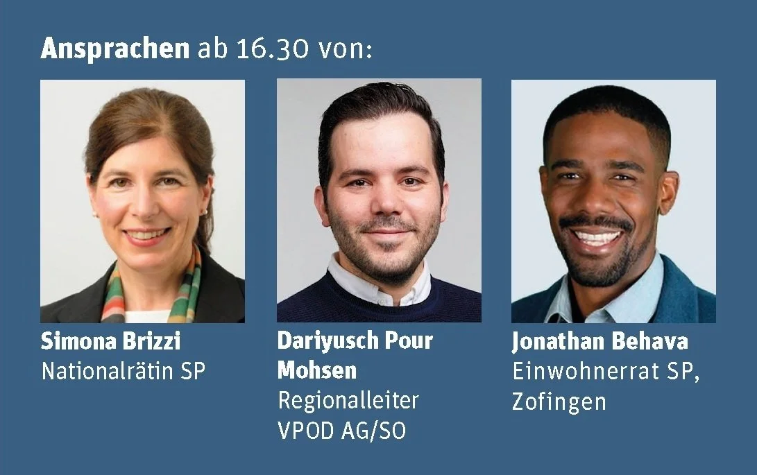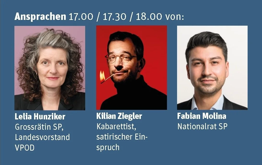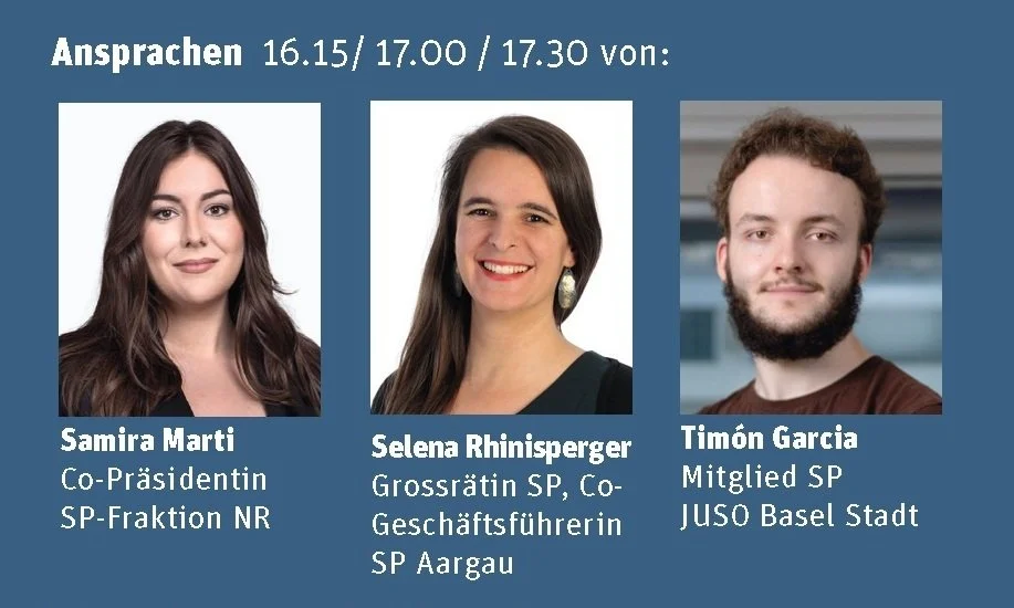 Reden: Claudia Rohrer, Vertretung DGB, Samira Marti, Selena Rhinisperger, Timón Garcia