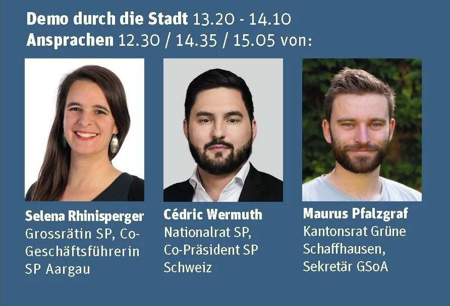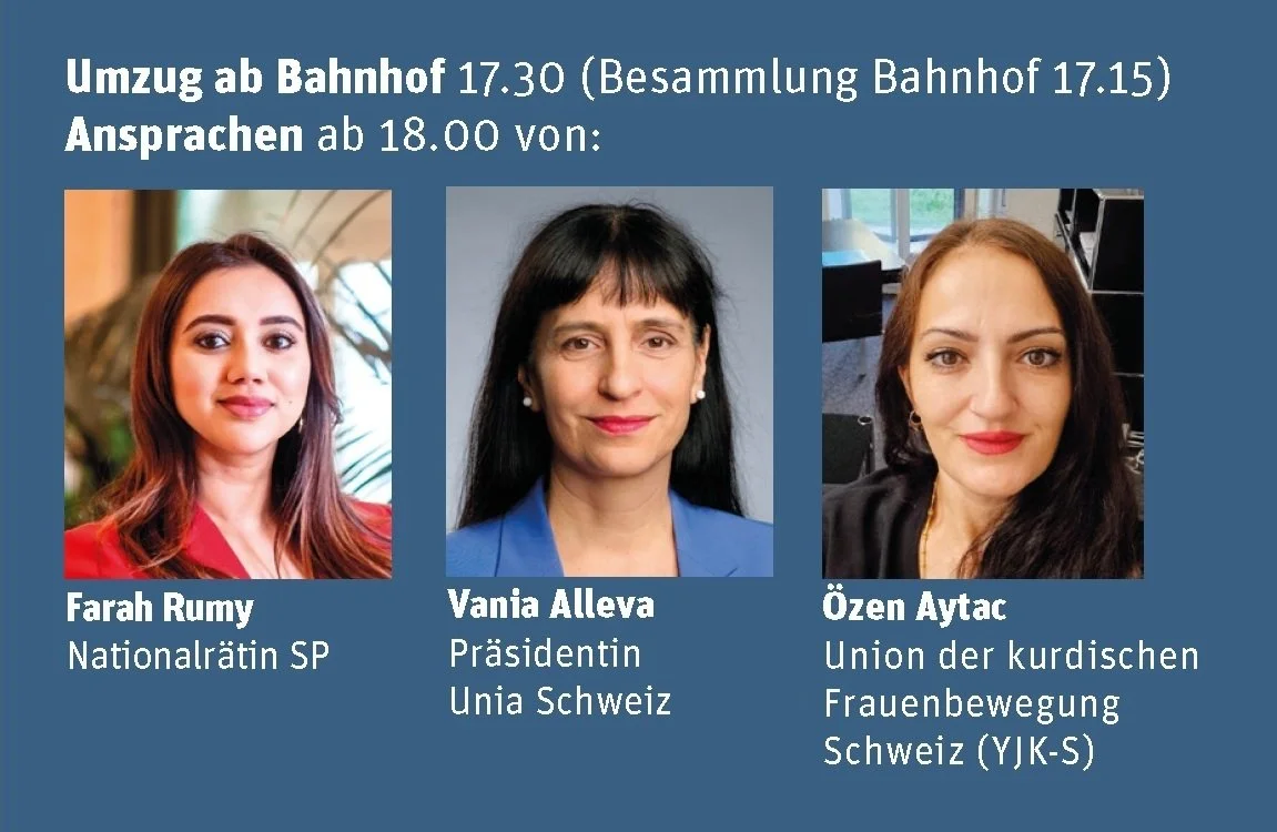 vorher Umzug vom Bahnhof zur Markthalle (Besammlung am Bahnhof Aarau um 17:15)Reden von Farah Rumy, Vania Alleva, Özen Aytac